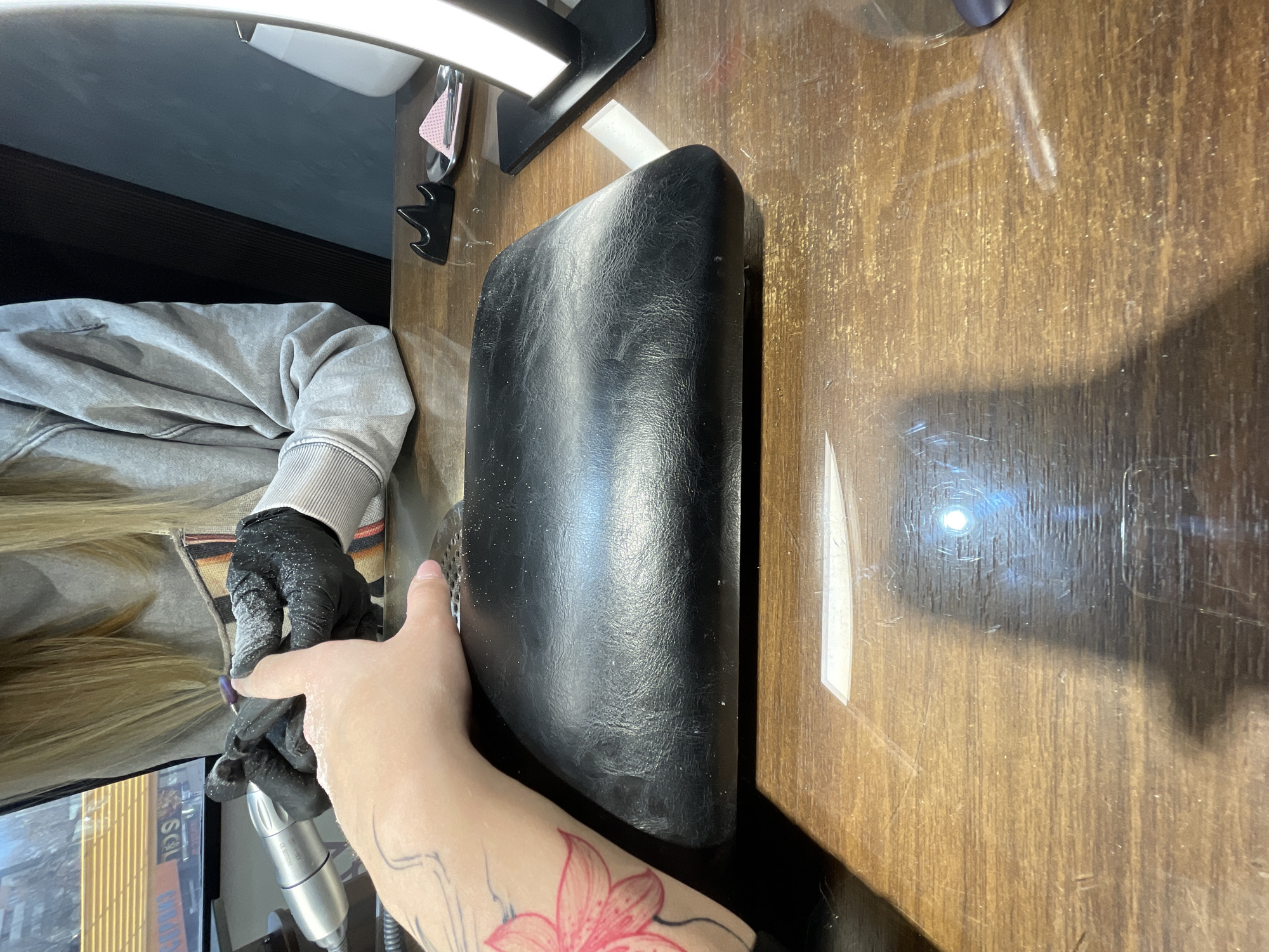 An interior shot depicts a nail service underway at what appears to be a salon or studio in Sofia, Bulgaria. The central focus is the interaction between a client's left hand and a nail technician's gloved hands. The client's forearm, displaying a red floral tattoo, rests on a worn black synthetic leather wrist cushion positioned on a wooden table. The client's hand is visible, with the thumb slightly elevated, and traces of white nail dust are present on the skin. Opposite, the nail technician's mid-torso, clad in a grey hooded sweatshirt, and blonde hair are visible. The technician wears black nitrile gloves, heavily coated with white nail dust, and is actively manipulating the client's finger with a silver electric nail drill. The working surface is a polished wooden table, covered by a clear protective layer showing multiple scratches and reflections. To the right, a white rectangular LED desk lamp on a black base illuminates the scene. Nearby are a small black multi-pronged stand and a silver dish containing several small pink triangular pads. The background includes a dark wall to the far right. Through a large window in the background, an urban exterior is visible. Reflections on the window prominently display Cyrillic text "ИЗОС БОРСА" (IZOS BORSA) and "СЕРВИЗ" (SERVIZ) against a building with horizontal yellow paneling, identifying the specific location as being in the vicinity of **Bulgaria Blvd 58, Sofia, Bulgaria**.
