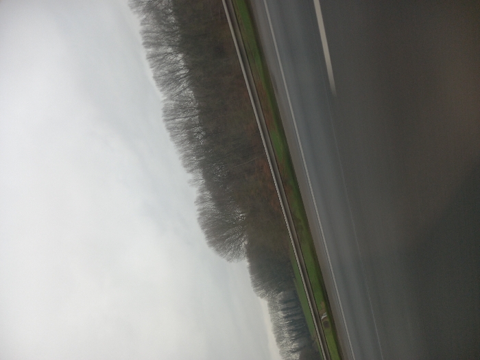The image presents a roadside view in Waasmunster, Belgium. A dark gray asphalt highway occupies the lower and mid-section of the frame, featuring distinct white lane markings. A silver-colored metal guardrail runs parallel to the road, positioned on a narrow strip of green grass. Beyond the guardrail and grass, a dense line of deciduous trees, largely bare of foliage, forms a natural barrier, suggesting a late autumn or winter season. The sky above is uniformly overcast and light gray, indicating a cloudy day. No individuals or other vehicles are visible. The overall composition shows motion blur on the road surface, consistent with a photograph taken from a moving vehicle.