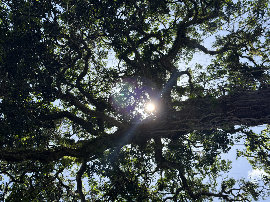 A low-angle shot captures the sprawling canopy of a large tree