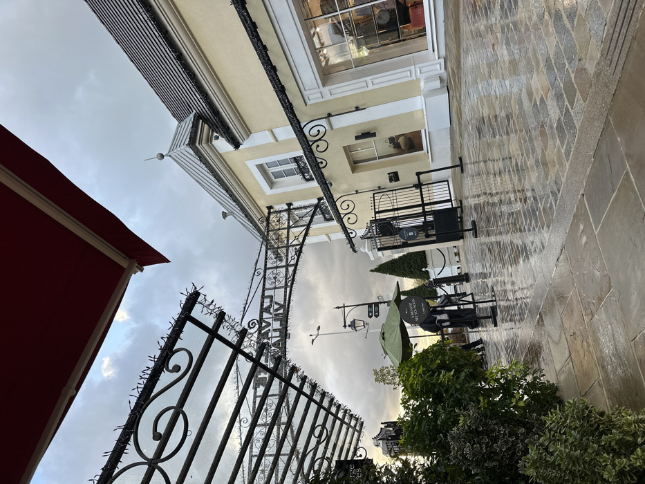 The image depicts an outdoor pedestrian shopping area within La Vallée Village in Serris, France, under an overcast sky. The ground, paved with irregular light and dark grey cobblestones, appears wet, reflecting light. In the upper left, a dark red awning extends into the frame. Beneath it, an elaborate black wrought iron archway, adorned with unlit decorative lights and featuring the words "LA VALLÉE VILLAGE," spans overhead. To the right of the archway, a light yellow building with white trim, a dark tiled roof, and a visible dormer window stands. Below this, a storefront with a large display window showcases various items, including bags. In the mid-ground, to the left, green foliage from bushes lines the pathway. Further down, a large green outdoor umbrella covers a small kiosk or stand. Several indistinct human figures are visible near the kiosk and further along the pathway. A tall black street lamp with multiple arms and a directional signpost are also present. Decorative black gates and crowd control barriers are positioned along the pathway and near building entrances, suggesting controlled access or queuing areas. White planters containing conical evergreen trees are intermittently placed along the facade.