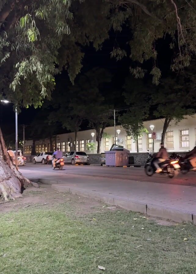 The video depicts a night scene in what appears to be a town or city, with a street lined with trees on one side and buildings on the other. Cars and motorcycles are seen driving along the street. Some are parked along the building side. Two people stand in front of a building. The camera moves from left to right. The scene is illuminated by streetlights.