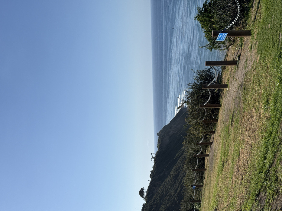 A vibrant coastal scene features a clear blue sky meeting the ocean's horizon. A grassy, partly dry path leads towards the edge, secured by wooden posts linked with metal chains. Lush green vegetation thrives on the hillside, while the sea glistens, suggesting a sunny day. A sign mounted on a post provides a glimpse of information to those who pass.