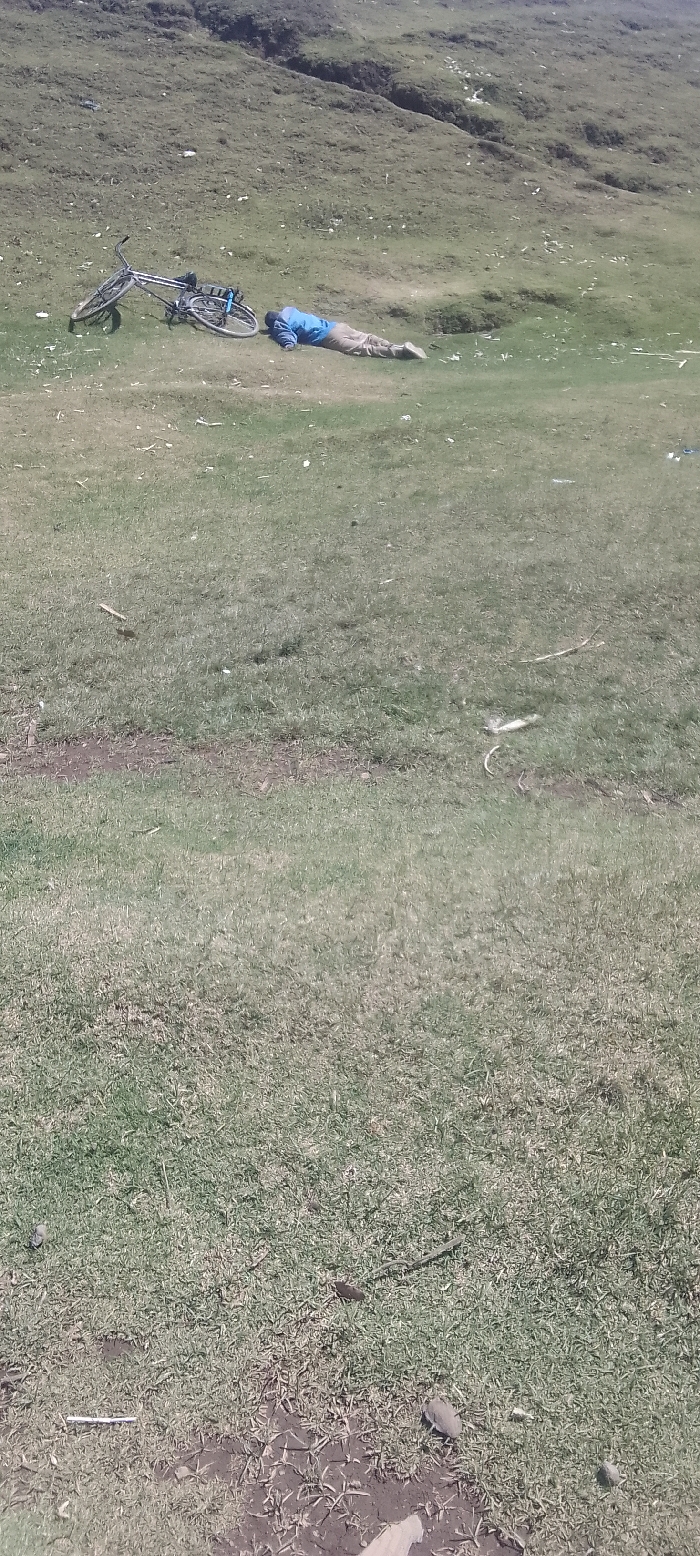 In a grassy outdoor area in Flyover, Kenya, a single individual is observed lying prone on the ground, face down. The person is dressed in a blue long-sleeved garment and light-colored trousers with light-colored shoes. Approximately 1.5 meters to the left and slightly behind the individual, a dark-colored bicycle lies on its side on the grass, with its handlebars visible. The immediate surroundings consist of sparse green and dry grass, with patches of exposed soil and scattered debris across the terrain. A gently sloping, grassy hillside forms the background. The scene appears still, with no discernible activity or interaction.