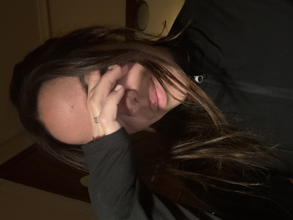 A woman with long, dark brown hair is seen from a close, angled perspective. Her face is partially obscured by her hand, which bears a ring. She wears a black long-sleeved shirt or jacket with a visible zipper. The lighting is dim, casting shadows across her face and clothing. A portion of a door is visible in the background, adding depth to the image.