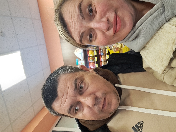 A selfie captures a couple in what appears to be a store. The woman has light skin, blonde hair, and wears a gray hoodie and a cream-colored jacket with fleece lining. She smiles toward the camera. The man, with darker hair and skin, is positioned below her, wearing an Adidas hoodie with a brown neck. Shelves filled with various items are visible in the background. The lighting is bright, indicating an indoor setting.