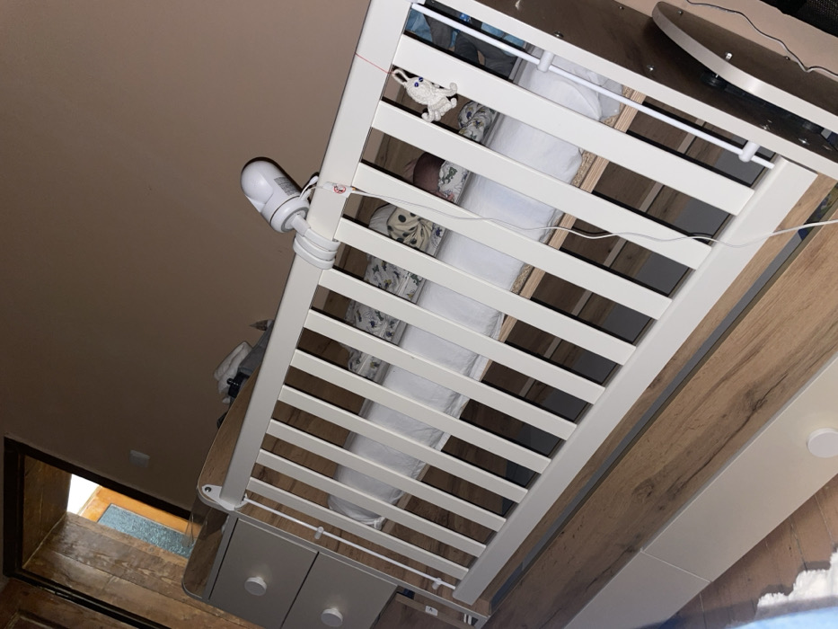 The scene depicts an interior room, primarily focused on a white baby crib positioned on a light wood-toned floor. A white baby monitor camera is clamped to the top right rail of the crib, with its white cable extending downwards towards the interior. A small, white, possibly crocheted animal hangs from a red string on the right side of the crib. Inside the crib, a white mattress is covered by white and patterned bedding. The top of an infant's head and a portion of its shoulder are partially visible within the crib, obscured by bedding and vertical crib bars. To the left of the crib, a light-colored dresser with two visible drawers, each equipped with a circular white knob, is situated. The room features plain light brown walls. In the upper left background, an open doorway with a visible wooden frame reveals a brighter area beyond. The lighting is dim throughout the visible area. The image contains no identifiable markers to confirm the location as Tarnava, Bulgaria.
