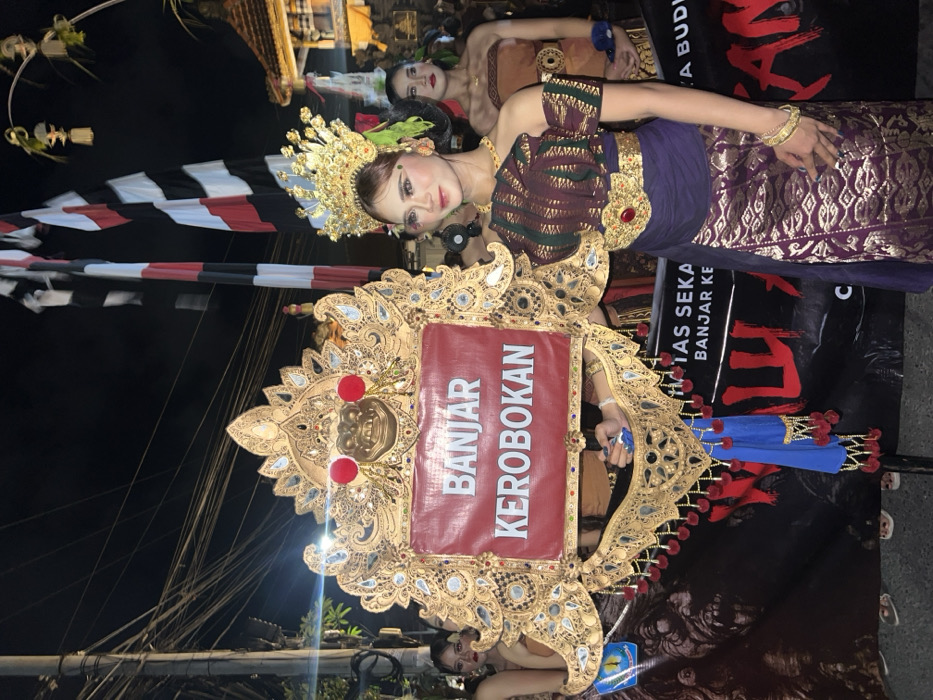 The image captures an outdoor nighttime scene in Munggu, Indonesia, depicting a cultural or ceremonial event. The primary subject is a woman on the right, adorned in elaborate traditional Balinese attire. She wears a golden crown, a dark reddish-brown patterned off-shoulder top, a gold belt with a red central jewel, a layered purple skirt, and gold bracelets. Her face features theatrical makeup with defined eyes, red lipstick, and a red forehead dot, and she exhibits a slight smile while looking towards the right. Adjacent to her left is a large, ornate golden standard or frame, held by an unseen individual whose hand is visible near the bottom. This frame is intricately carved, featuring a stylized golden mask at its apex and a central red panel with the white capitalized text "BANJAR KEROBOKAN." Red tassels and blue fabric strips hang from its lower sections. In the background, other individuals in traditional Balinese attire are partially visible. One woman is positioned to the far left, while another stands behind the main subject on the right, wearing a light brown strapless garment. The environment is illuminated by artificial light, revealing numerous overhead power lines against a dark night sky. Two tall poles draped with black and white checkered flags (poleng flags) are present, along with a traditional Balinese temple structure visible on the far right. A large black banner with red and white text, including partially visible words like "SEKA" and "BANJAR KE," and a stylized face, spans the lower portion of the frame.