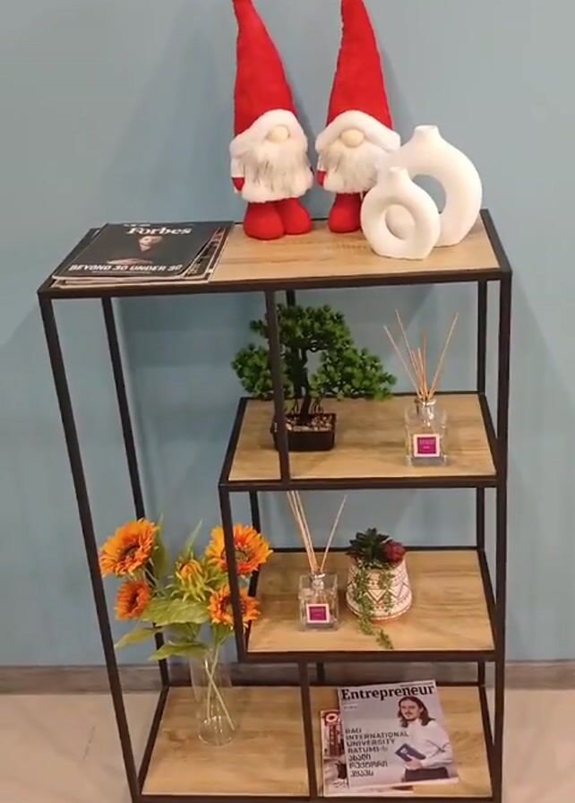 four-tiered shelving unit with a dark metal frame and light wood-look shelves. The top shelf contains a copy of Forbes magazine, two gnome-like Christmas decorations with red hats and white beards, and two white ceramic vases. The second shelf from the top holds a small decorative bonsai tree and a glass bottle with diffuser reeds. The third shelf contains another glass bottle with diffuser reeds and a small potted succulent. The bottom shelf contains a copy of Entrepreneur magazine and a glass vase holding orange sunflowers. The shelving unit is placed against a light blue wall and on a light brown tiled floor. The camera provides a static shot of the shelving unit.