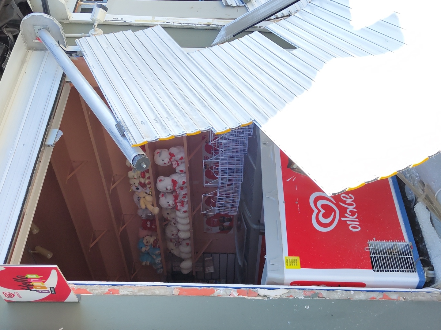 The image depicts a damaged retail storefront located in Givatayim, Israel. A silver-colored, corrugated metal security shutter is severely bent, partially detached from its upper housing, and hangs diagonally into the frame, obstructing the view of the store's interior. Exposed yellow trim is visible along the edges of the damaged shutter. Inside the store, multiple wooden shelves are visible displaying numerous plush toys, primarily white teddy bears with red accents on the lower shelf, and a mix of colorful plush animals on the upper shelves. Below the shelves, several white commercial freezers or display cases are present. The prominent red front of one freezer displays a white "Olkabe" logo (resembling a heart) and a cooling grate. White wire display baskets are stacked on top of these freezers. An exterior red sign with a white speech bubble displaying "Hello" and the Wall's/Algida ice cream logo is affixed to the light grey wall on the left side of the storefront opening. The area around the opening shows exposed brickwork and plaster damage. No individuals are visible in the scene. The overall lighting suggests bright daytime conditions, with some areas of the damaged shutter overexposed.