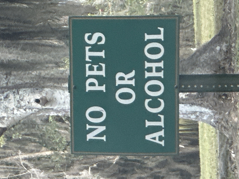 - "A rectangular, dark green sign with white serif text reading "NO PETS OR ALCOHOL" is positioned centrally, mounted on a dark green, ribbed metal post" by FM-14a6Y2, licensed under CC BY 4.0