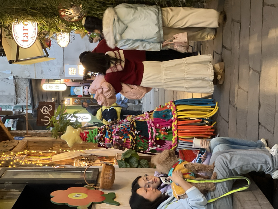This image depicts a narrow, decorated street scene in the Yuzhong District of Chongqing, China, during what appears to be evening or low-light conditions. The environment features stone-paved ground and buildings with exposed stone or plaster walls, adorned with numerous string lights and illuminated signs bearing Chinese characters, alongside one sign reading "taro" in English. Prominently in the center stands a large, multi-tiered sculptural decoration resembling a Christmas tree, constructed from various colorful yarns, fabrics, and small figurines, topped with a yellow star. On the left foreground, two women are seated on a wooden bench. The woman on the left, appearing middle-aged, wears a light blue hooded sweatshirt and gray sweatpants, holding a small brown poodle-type dog adorned with a yellow vest and a red harness with a green leash. She is holding a smartphone. Next to her, a younger woman wearing glasses, a purple top, and blue jeans holds a white cup. In the midground, several individuals are visible moving away from the camera. The central figure, seen from behind, wears a red long-sleeved top and a long, white tiered skirt, carrying a puffy pink jacket draped over their left arm. To their right, another person is also viewed from behind, wearing a light blue hooded jacket with a fur-lined hood and cream-colored pants, holding a light pink handbag. Further down the street, blurred figures and additional illuminated signs are visible, including a large nutcracker soldier decoration. Green foliage or vines adorn a structure on the right side of the street.