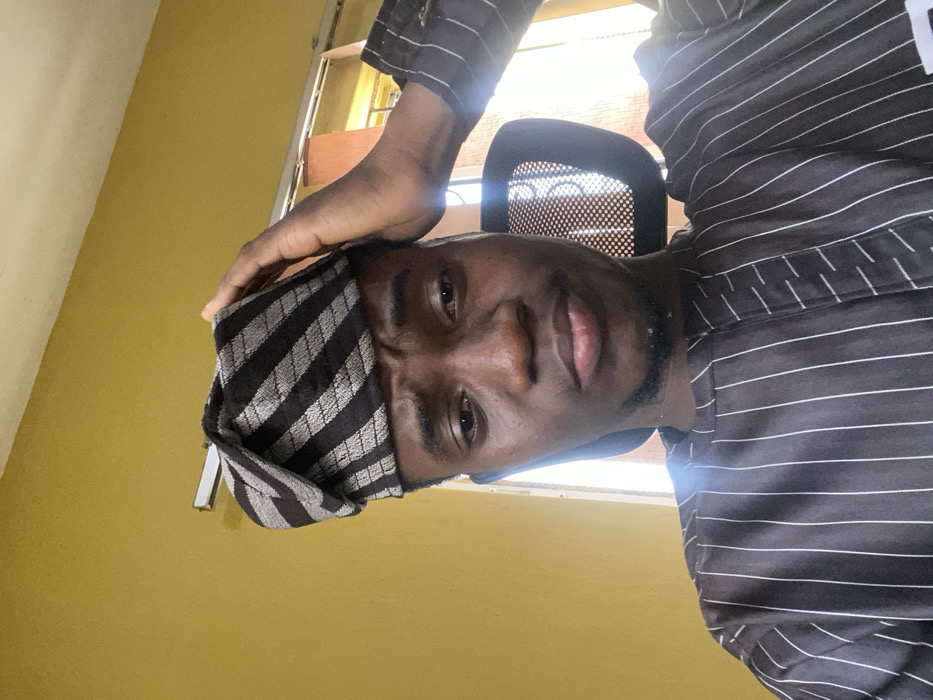 A young adult male is depicted in an upper-body frontal view, seated indoors in Egan, Nigeria. He has dark skin, short dark hair, and minimal facial hair. The subject wears a dark, long-sleeved, vertically striped shirt with thin white lines, and a black and grey diagonally striped traditional cap. His right hand is positioned on the top of the cap. His facial expression shows furrowed brows and a slightly downturned mouth. A black office chair with a mesh backrest is visible behind his left shoulder. The background consists of a solid yellow wall, with a horizontal light fixture on the left. To the right, a window or opening, partially covered by an orange-brown blind or curtain, allows ambient light.