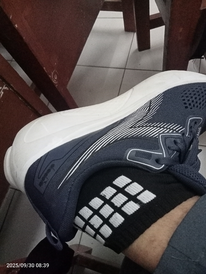 The image depicts a close-up view of a person's lower right leg and foot in an indoor setting. The specific location within Kasioni, Kenya, is not discernible from the visual evidence. The subject is wearing a dark blue athletic shoe with a prominent white sole. The shoe features white striped designs on its lateral side, a perforated toe box, and blue laces tied at the vamp. A brand logo, "Diadora," is visible on the side of the shoe near the heel. Underneath the shoe, a black ankle-high sock with a distinctive grid pattern of white squares is visible, covering the wearer's foot. A portion of dark-colored trousers or sweatpants is visible at the upper right, covering the lower leg above the ankle. In the background, to the left and beneath the foot, a section of reddish-brown wooden furniture, possibly a chair or table leg, is visible. The wood appears worn and shows some scratches. The floor surface consists of light-colored square tiles with dark grout lines. A digital timestamp "2025/09/30 08:39" is overlaid in the lower-left corner of the image. The scene is illuminated by ambient indoor lighting.