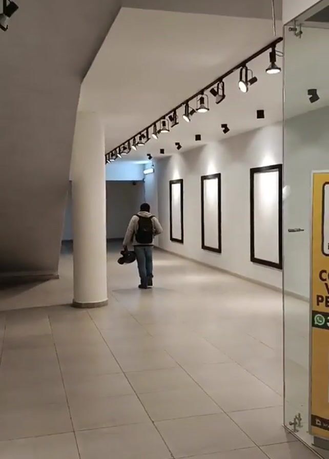 man walking down a corridor with a black backpack and carrying a dark object, possibly a musical instrument, in his right hand. The corridor has white walls, tiled flooring, and a row of track lighting along the ceiling. Several framed empty spaces adorn the right wall. On the right side of the video, there's a glass wall displaying advertisements for real estate services. A large white pillar stands on the left side of the corridor. There appears to be a staircase on the left as well.