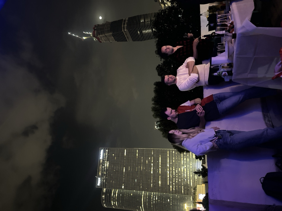 The image depicts four individuals—one female and three males—on an outdoor rooftop or terrace at night in Tel Aviv, Israel