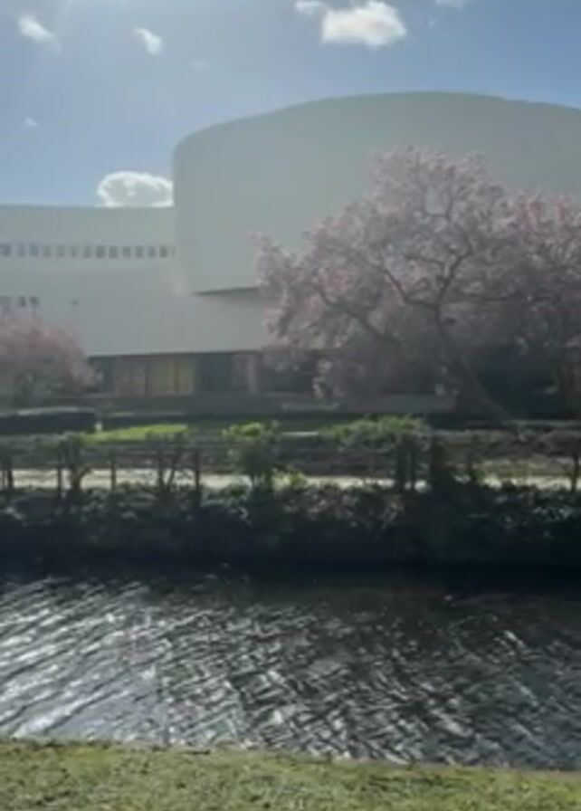 tranquil scene with a body of water in the foreground and a modern white building in the background. A small, green, grassy area separates the viewer from the water, and a low hedge runs along the edge of the bank. The water is dark with light reflections on its surface suggesting movement. Adjacent to the building are trees in full bloom, covered in pink flowers, providing a touch of color and nature to the scene. The sky is light blue with a few puffy white clouds and the sun shining brightly. The overall atmosphere is peaceful and serene, conveying a sense of natural beauty juxtaposed with modern architecture.