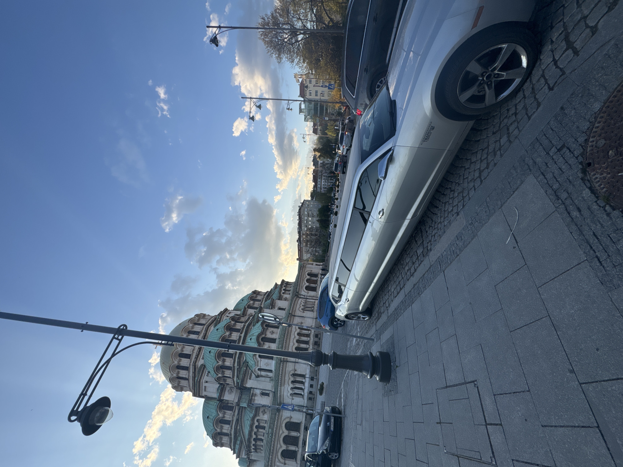 Alexander Nevsky Cathedral in Sofia, Bulgaria, viewed from street level. A street lamp is visible in the foreground, partially obscuring the lower section of the cathedral. Cars are parked along the side of the street, including a silver car occupying a significant portion of the right side of the frame. The sky is partly cloudy, with sunlight illuminating the building and the sky. The street is paved with stone tiles.