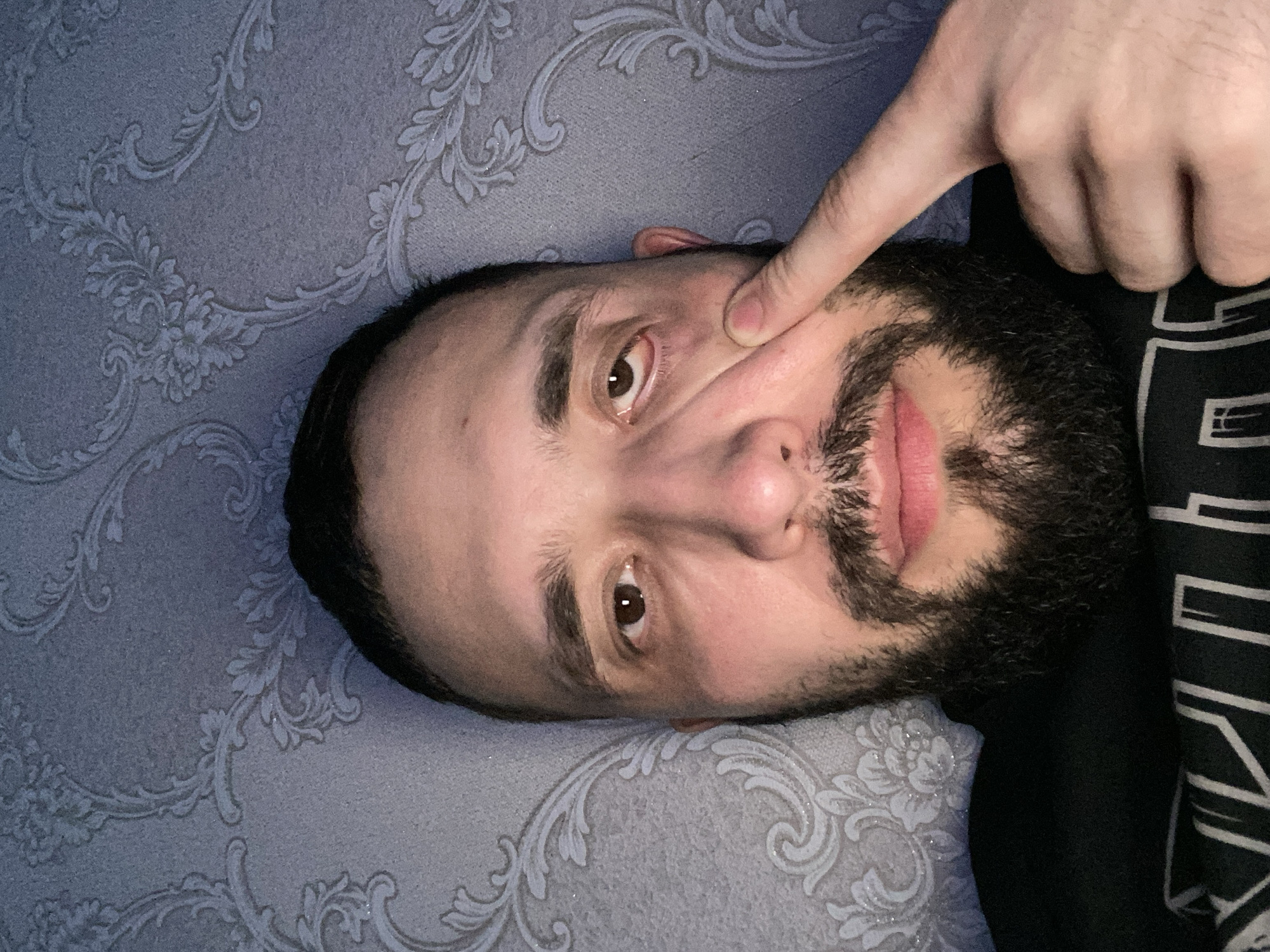A man with a beard is lying on his side on a patterned blue surface. He is looking at the camera with one eye open. His right index finger is on his cheek. He is wearing a black shirt. The location is not specified, although the prompt mentions Chaikovsky, Russia.