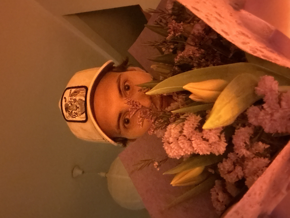 The image depicts an indoor, close-up scene with a single individual partially obscured by a bouquet of flowers