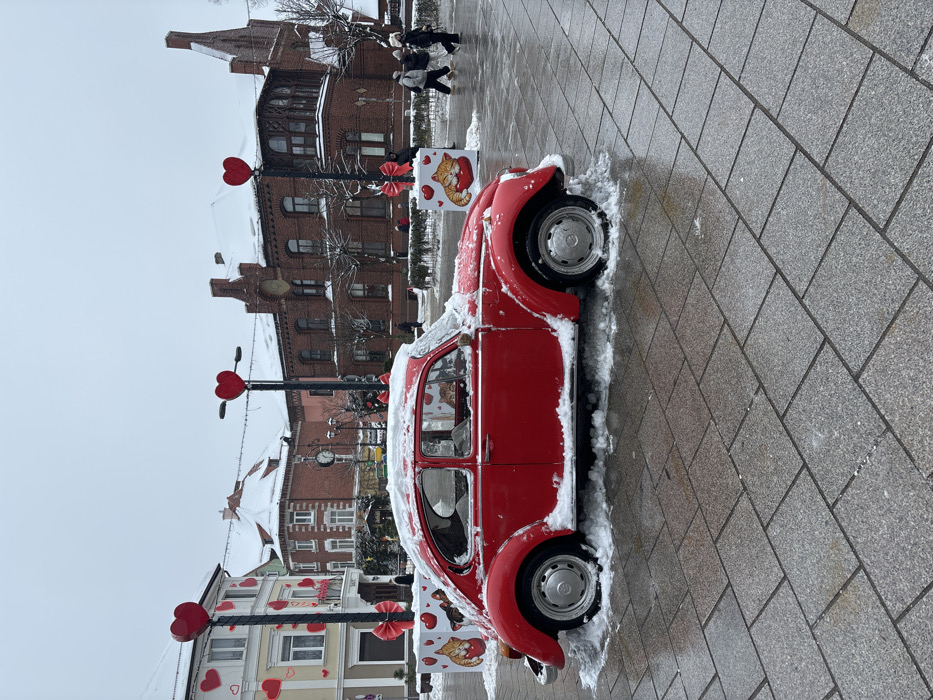 A red classic Volkswagen Beetle, substantially covered in snow, occupies the foreground of a paved urban square in Zelenogradsk, Russia, under an overcast sky. An orange cat figurine is visible within the vehicle's passenger compartment through the side window. The ground comprises wet, grey rectangular pavers with residual snow. Decorative white rectangular boxes, featuring cartoon cat illustrations and red hearts, and topped with red bows, flank the car. Tall black poles surmounted by large red heart ornaments are positioned behind the central display. Background architecture includes a light-colored building on the left, adorned with multiple red hearts, and a prominent, multi-story brick structure on the right with a complex, snow-covered roof and a visible clock face on its facade. Several individuals in winter clothing traverse the paved area in the mid-ground.