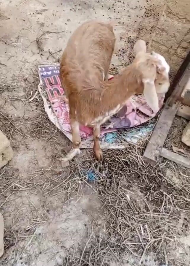 tan goat with a white patch on its head standing on a piece of colorful fabric on the ground. The ground is covered with dirt, straw, and dark specks. There is a chicken visible in the background. The goat looks around and then directly at the camera. There are rocks and pieces of wood around the edges of the frame.