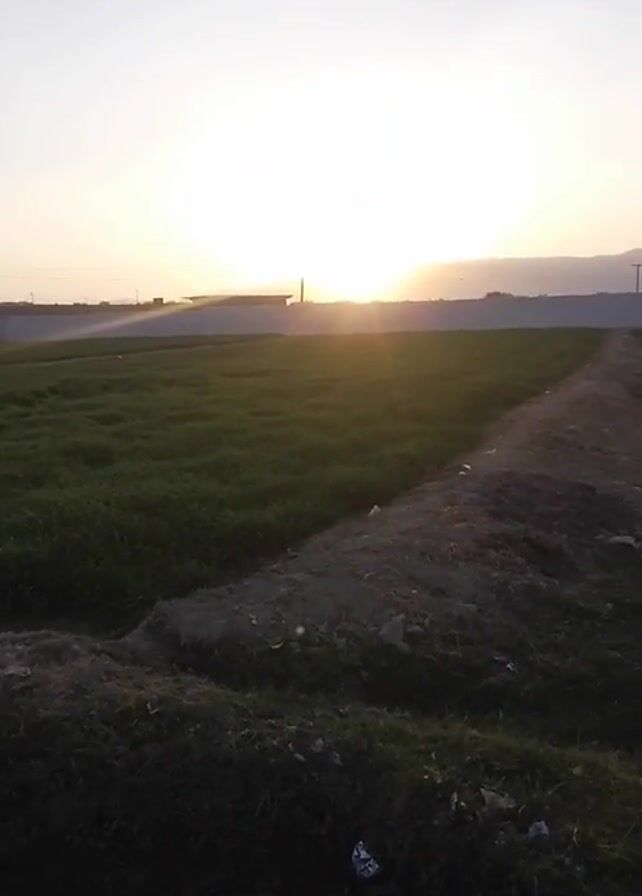 The video pans across a rural landscape at sunset. It starts with a view of a green field intersected by a dirt path, with a wall and distant mountains visible in the background. The sun is setting, casting a golden glow over the scene. The camera then moves to the right, revealing a paved road with streetlights. The road runs alongside the green field, separated by a strip of gravelly terrain. There are no people visible in the video. The scene is quiet and peaceful, with the only sounds likely being natural or ambient.