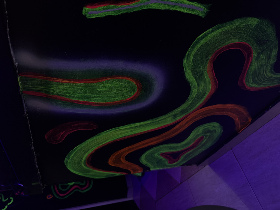 A low-angle shot depicts a ceiling adorned with abstract, swirling patterns. Bold strokes of neon green and vibrant red paint create a layered effect on a dark surface, possibly under blacklight conditions. These patterns resemble topographical lines. The overall aesthetic evokes a retro or psychedelic vibe. The setting appears to be an entertainment venue or a room with specialized lighting, as evidenced by the purple ambient glow washing over the adjacent tiled wall.