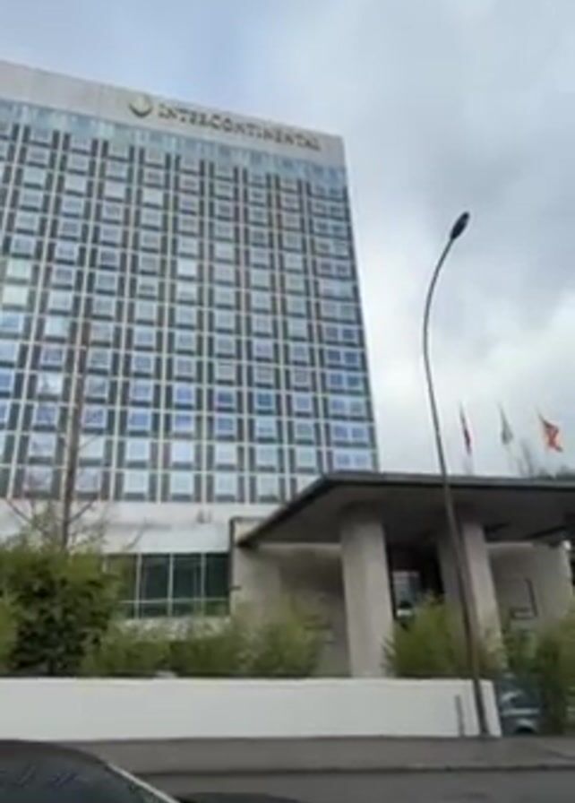 street view of the Intercontinental hotel. The tall, rectangular building is many stories high with rows of evenly spaced windows. The entrance is marked by a modern, low-lying structure with supporting pillars and flags displayed in front. A black compact car, with the license plate "Z61 658", is parked on the street in front of the hotel. The sky is overcast.