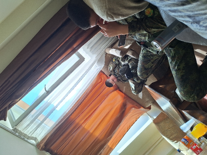 An indoor scene depicts three individuals in a casually furnished room, likely a living room or common area. The precise location within the city of Sofia, Bulgaria, is indeterminable from the image. Three males are present. In the foreground, partially visible, is an individual whose legs, clad in digital camouflage trousers, are prominent. A gray beverage can, labeled "REDBULL," rests on their left thigh. Their right hand holds a black smartphone. Further back, another male in a full digital camouflage uniform reclines on a light-colored upholstered couch, appearing to look at the smartphone held by the foreground individual. In the background, a third male, also in a digital camouflage uniform, is seated or reclining on a second light-colored upholstered couch, looking towards the left. A wooden coffee table in the upper left holds a plastic bottle of Coca-Cola, a plastic bottle of Fanta orange, and two plastic cups, one containing a yellow liquid. A large window on the right side of the frame is partially ajar, revealing a clear blue sky and allowing bright natural light into the room. The window is fitted with sheer white inner curtains and opaque orange-brown outer curtains, partially drawn. The walls are light-colored. The overall scene suggests a relaxed, informal gathering during daytime hours.