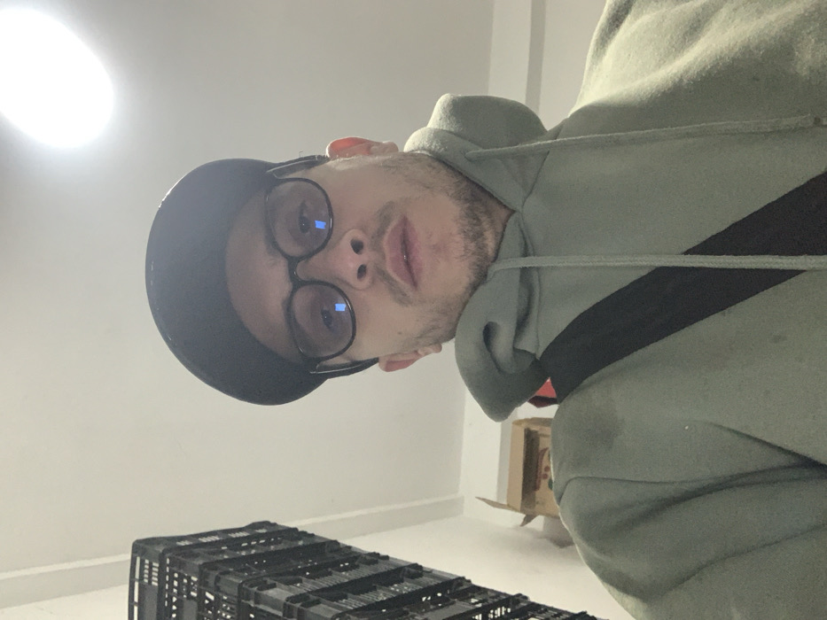 An adult male, estimated to be in his 20s or 30s, is depicted in a low-angle, head-and-shoulders indoor portrait. He is wearing a black baseball cap, dark-rimmed glasses with blue reflections on the lenses, and a sage green hooded sweatshirt. A black strap, likely from a bag, crosses his chest. He has short facial hair and a neutral expression, looking directly at the camera. In the background to the left, a vertical stack of black plastic crates is visible against a white wall. A brown cardboard box is partially discernible behind his right shoulder, also against a white wall. A bright, circular overhead light source is present in the upper right portion of the frame. The environment is an interior utilitarian space with white walls and ceiling. The specific location within the city of Meknes, Morocco, is not discernible from the visual evidence.