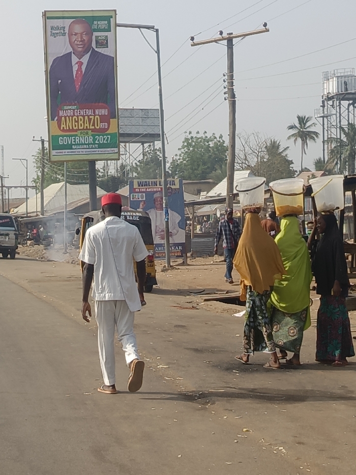 The image depicts a daytime street scene in Nassarawan Eggon, Nasarawa State, Nigeria. The environment is characterized by a paved asphalt road, unpaved dusty shoulders, and a clear, hazy sky. In the foreground, a male figure with dark skin, wearing a white short-sleeved traditional tunic, white trousers, and a red cap, walks away from the camera on the left side of the road, wearing brown sandals. To the right of him, three women are walking towards the camera. Each woman carries a clear plastic bucket with contents on her head. The leftmost woman wears a patterned long skirt, a light green head covering, and a light green garment. The middle woman wears a patterned long skirt and an orange/brown head covering. The rightmost woman wears a dark patterned long skirt and a dark head covering. In the mid-ground, on the left, a white van or bus is partially visible behind a plume of white smoke. A yellow motorized tricycle (keke napep) is partially visible behind the foreground male figure. On the left side of the road, a large vertical billboard displays "MAJOR GENERAL NUHU ANGBAZO RTD FOR GOVERNOR 2027 NASARAWA STATE" with an image of a man in a suit. Further to the right, a smaller poster or banner features a man in white traditional attire with the text "WALIN LIFIA IS THE ANSWER" and "ABUBAKAR GOVERNOR." The background reveals a series of low-rise buildings with corrugated metal roofs lining the street. A wooden utility pole with multiple cross arms and electrical wires stands on the right side of the road. A metal water tower is visible on the far right, partially obscured by trees, including a palm tree. Several indistinct figures are visible walking in the distance.