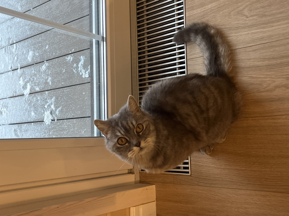 The image displays an indoor domestic scene situated in Finskiy Briz, Russia. Centrally positioned on light-colored wooden floorboards is a grey tabby cat with subtle markings and large amber eyes. The cat sits upright, its head tilted distinctly to the left, directing its gaze towards the viewer. Immediately behind the cat, a metallic floor vent with parallel slats is integrated into the floor. Beyond this, a white window frame delineates the interior from an exterior view. The outdoor environment consists of a dark wooden deck partially covered with scattered patches of snow. A white door jamb is partially visible along the left edge of the frame. No human individuals are present within the scene.