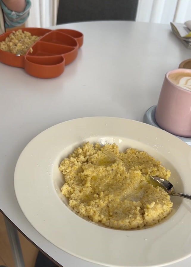 white table with a plate of porridge with a spoon on it, a latte in a pink mug, and a brown sectional plate also containing porridge. A baby in the background is drinking from an orange cup. The porridge on the white plate looks like it has butter melted on top. The setting appears to be a dining area with a window covered by sheer curtains in the background.
