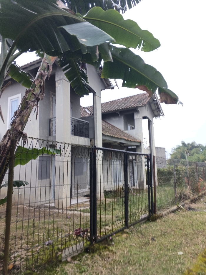 An outdoor scene in Ream Quarter, Cambodia, depicts a two-story, light-colored concrete building, likely a house, appearing partially constructed or unfinished. The building features a brown-tiled roof section, multiple windows (some with light blue frames), and two upper-story balconies with black metal railings. A tall banana tree with large green leaves dominates the left and central foreground, partially obscuring the structure. In the midground, a black metal wire mesh fence with a double gate spans the width of the frame, separating a sparse, unkempt grassy foreground from the building's immediate vicinity. The sky is overcast. Beyond the building and fence to the right, overgrown vegetation and another fence line are visible. No people, actions, or interactions are observed.