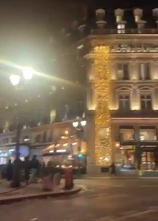 night scene in a city. A building with Christmas lights is visible on the right side of the screen. A French flag is flying atop the building. A street lamp is on the left side of the screen. There are people walking along the sidewalk. A person on a bicycle rides across the street. A small red vehicle is also visible on the street.