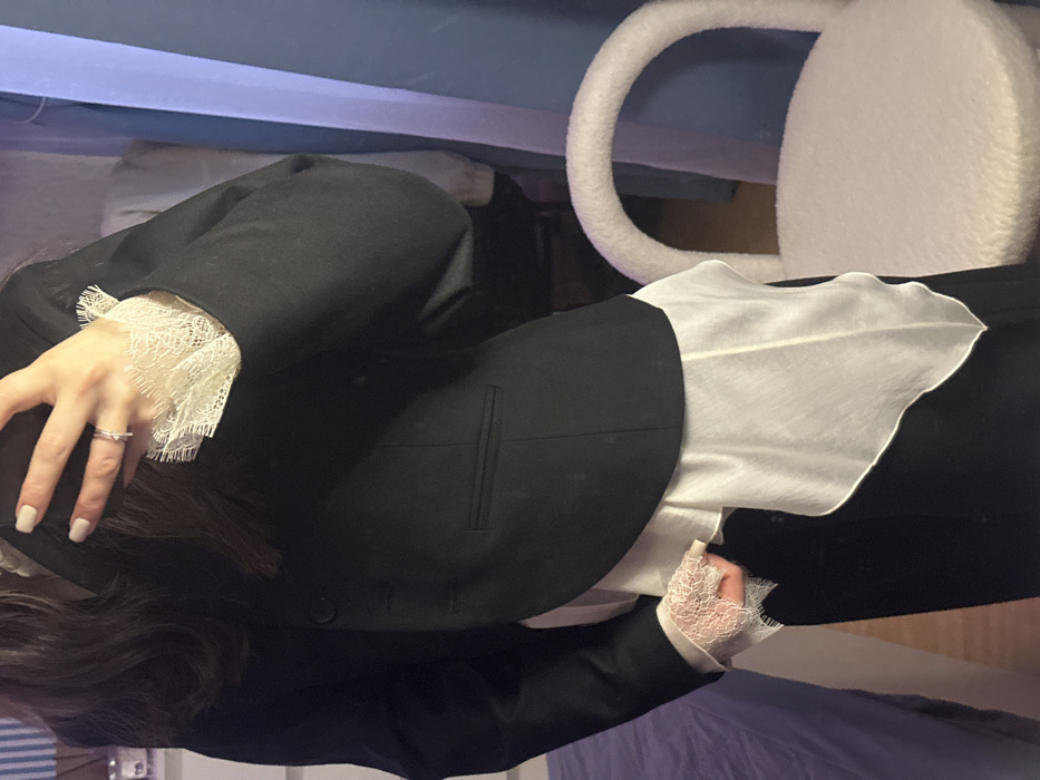 An indoor, chest-level self-portrait captures an individual in a reflective surface. The subject, likely female, is dressed in a black, single-button blazer with a visible pocket flap on the right side. A white, possibly sheer, garment with an asymmetrical, pointed hem extends beneath the blazer. White lace cuffs are present at both wrists, extending from the blazer sleeves. The subject's right hand is raised, holding a smartphone, which obscures upper facial features. The hand displays light-colored nail polish and a ring with multiple stones on the ring finger. Dark trousers or a skirt are visible below the white garment. The immediate background on the left includes a blurry reflection of a purple or dark blue object. On the right, a white, textured chair with a curved back and round seat is present. Beyond the chair, a blue curtain or wall is visible. This scene is located in Nekrasovskiy, Russia.