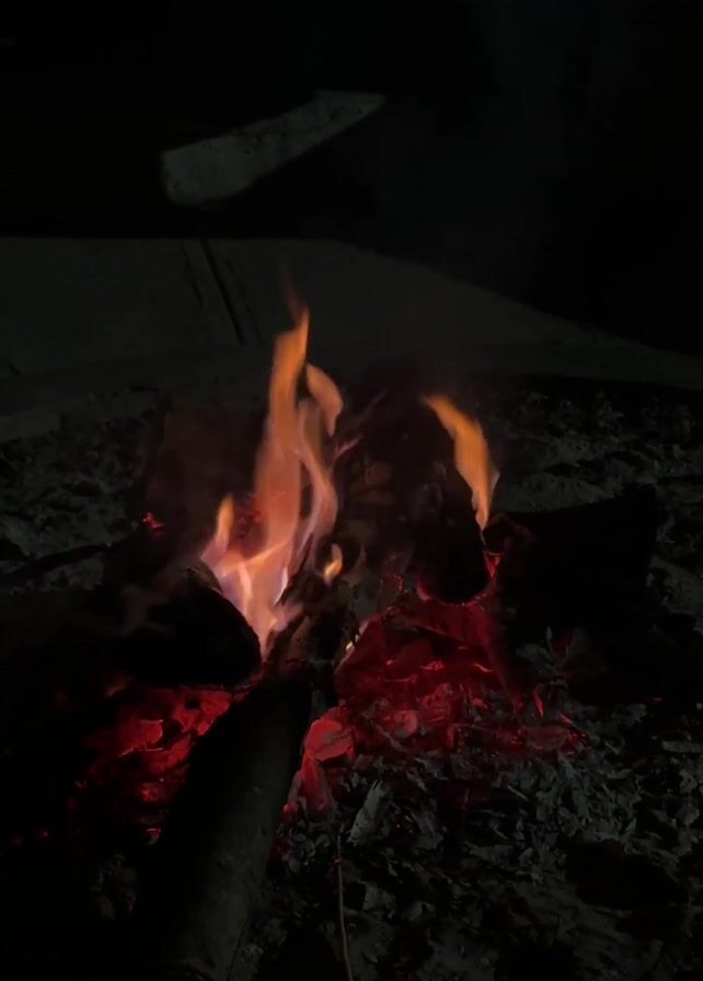 campfire at night. The fire is burning in a pit, surrounded by ash. There are several pieces of wood in the fire, and the flames are bright orange and yellow. The area around the fire is dark, with only a few patches of light. There are people nearby, but they are mostly obscured by the darkness. The sound of music and conversation can be heard in the background.