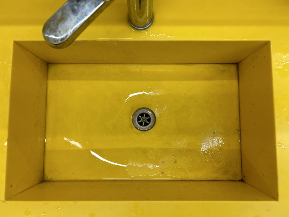 - "A rectangular, yellow bathroom sink with a chrome faucet is viewed from above" by FM-kYqve2, licensed under CC BY 4.0