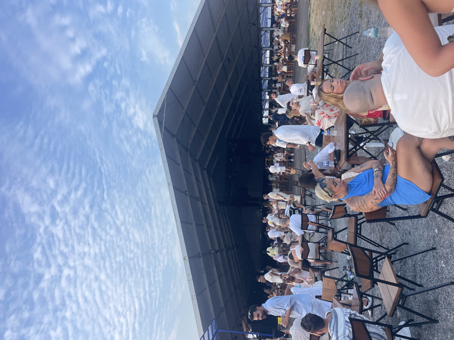 This image captures a wide-angle view of an outdoor daytime gathering at a temporary event venue in Rio De Janeiro, Brazil. Approximately 50-70 individuals, predominantly young to middle-aged adults, are visible, with a significant number dressed in white or light-colored attire, suggesting a theme or dress code. In the background, a large, white, peaked tent structure with a visible metal frame provides a central focal point and possible shelter. Its interior appears darker in contrast to the bright exterior. In front of and extending from the tent, numerous simple, light-colored wooden and metal tables and chairs are arranged across an unpaved ground surface composed of gravel or compacted earth. People are observed standing and socializing in groups, while others are seated at tables. In the mid-foreground, a woman with short blonde hair, wearing a blue halter-neck mini-dress, is seated, holding and looking at a mobile phone. She has visible tattoos on her arms and legs. To her right, another woman is seated at a table, wearing a floral-patterned dress. In the immediate foreground, a man with a shaved head is seated with his back to the camera, wearing a white t-shirt. On the tables, plastic water bottles and other beverages are present. The sky is a clear light blue, marked by widespread, textured white clouds, indicating fair weather conditions. The overall scene depicts a casual, social outdoor event.
