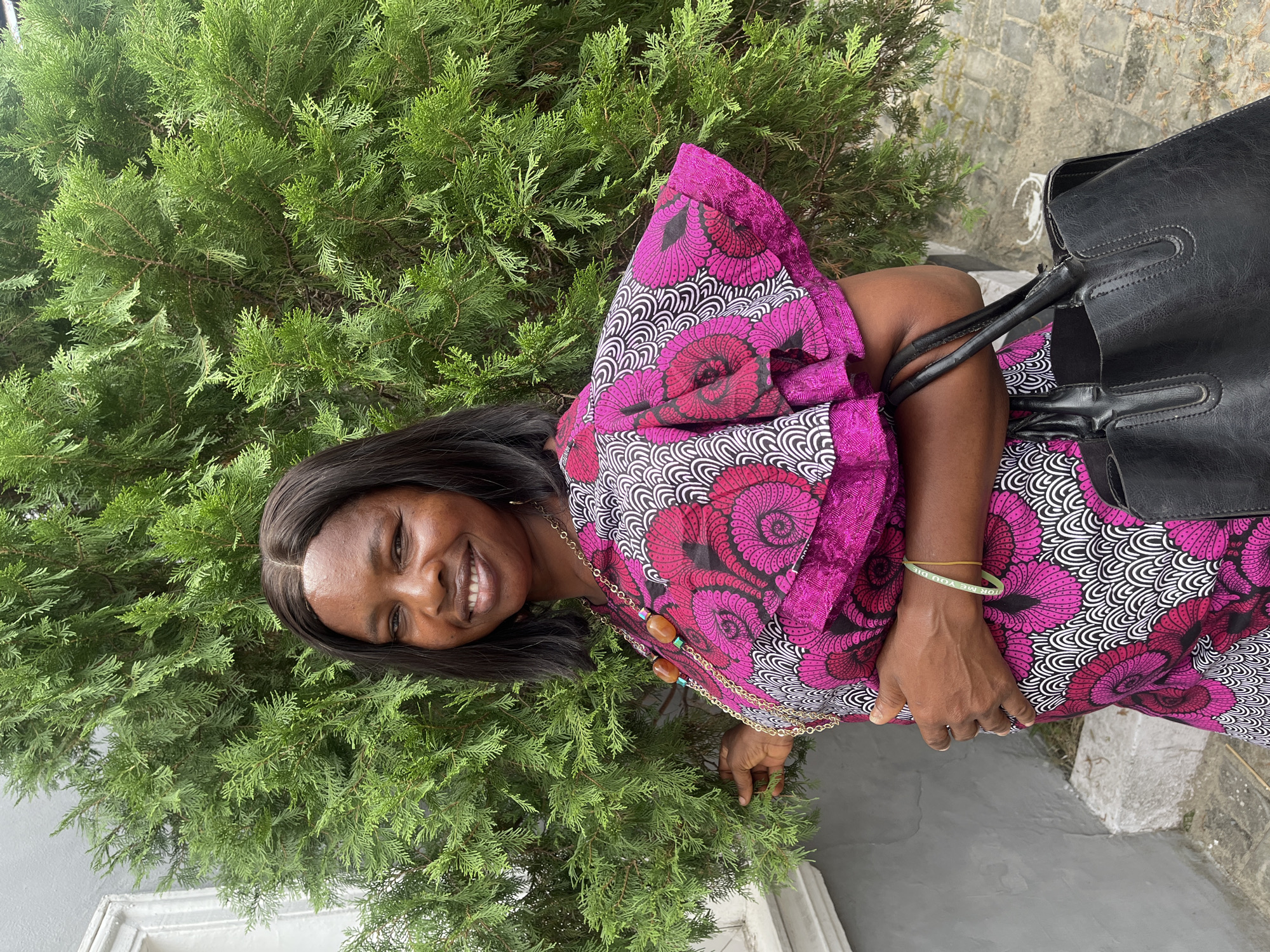 A medium shot depicts a woman standing outdoors near a cedar-like tree, situated in Ado, Nigeria. She wears a dress with a vibrant pink and white floral pattern, accessorized with a gold necklace and a green wristband. A black leather bag hangs on her shoulder. The background includes a grey wall and a white window frame, indicating an urban setting. The woman is smiling, looking directly at the camera, and appears to be touching the tree's leaves with her right hand.