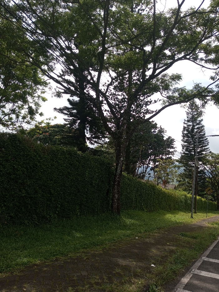 The image displays an outdoor daytime scene within Namthoung, Laos, characterized by lush vegetation and urban infrastructure elements. In the foreground, a dark, uneven paved pathway, intermingled with patches of green grass and minor debris, extends horizontally. To the immediate right, a darker paved surface, likely a road, is visible with partial white markings. A dense, dark green hedge forms a prominent horizontal barrier across the midground, separating the pathway from an elevated, vegetated area. Multiple trees populate the scene, including a broad, deciduous tree with a rough-barked trunk and extensive canopy dominating the center, and a tall, conical evergreen tree situated on the right. A grey utility pole with numerous overhead wires is positioned on the right side, partially obscuring a yellow diamond-shaped road sign featuring a black right-curve arrow. In the background, beyond the foliage, indistinct verdant hills or mountains rise under a bright, largely overcast sky. No individuals or specific actions are observed within the frame.