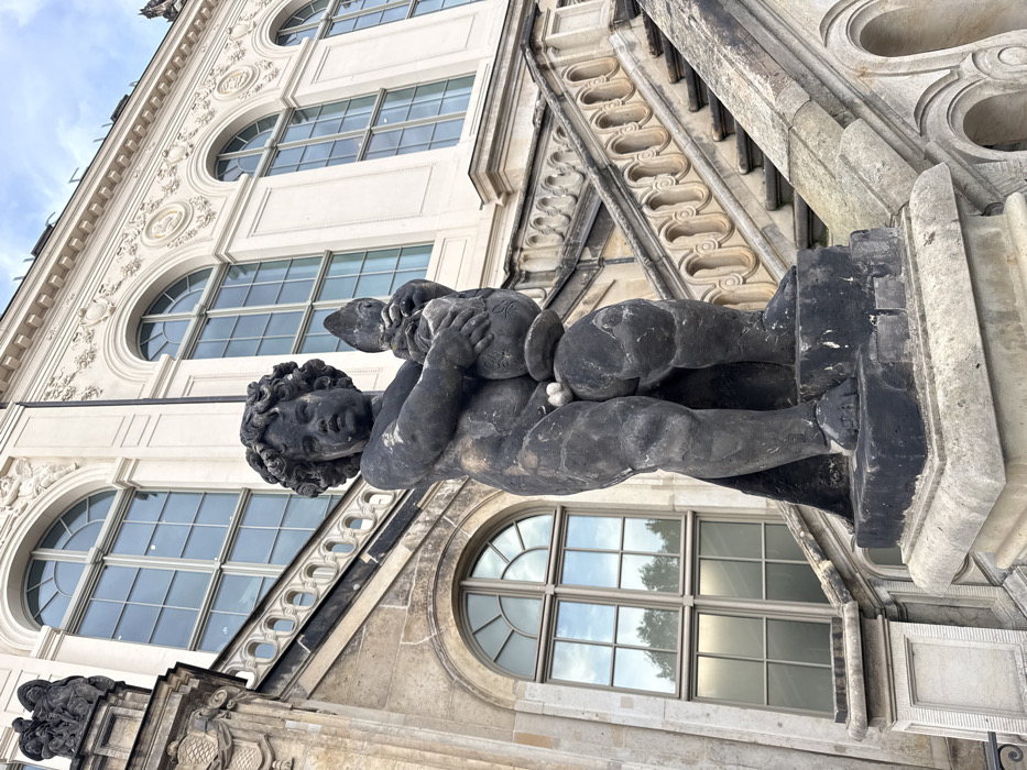A weathered dark grey stone statue of a nude putto stands prominently in the foreground, positioned on a dark plinth atop a lighter stone base. The putto possesses a plump, childlike physique, curly hair, and visible genitalia, holding a decorated, vase-like vessel with both hands at its waist. Behind and to the right, a grand Baroque-style building with a light-colored, ornate facade features multiple large arched windows with multi-pane glazing, reflecting an overcast sky. A stone staircase with an elaborately carved balustrade ascends behind the statue, curving towards the left. To the left and slightly below the main building, another large arched window is visible within a plainer stone wall, also reflecting the sky and tree branches. The scene is located within the Zwinger Palace complex in Dresden, Germany.