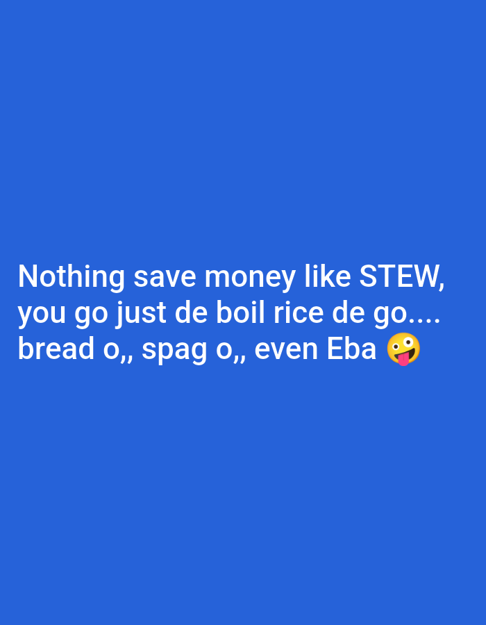 This image depicts a static graphic on a solid, uniform blue background. White text, rendered in a sans-serif font, is horizontally centered in the lower half of the frame. The text reads: "Nothing save money like STEW, you go just de boil rice de go.... bread o,, spag o,, even Eba". A "face with stuck-out tongue and winking eye" emoji is positioned immediately following the text "Eba". No people, objects other than the text and emoji, or specific actions are visible. The scene is located in the City of Unknown, Unknown.