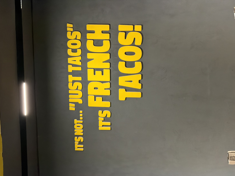 An interior wall of a commercial establishment in Constanța, Romania, is depicted. The wall is painted a dark grey. Prominent yellow, three-dimensional lettering is affixed to the wall, displaying the text: "IT'S NOT... "JUST TACOS" IT'S FRENCH TACOS!". The phrases "IT'S NOT..." and ""JUST TACOS"" are rendered in a smaller font size compared to "IT'S FRENCH TACOS!". A linear, white LED light fixture is mounted horizontally on a dark overhead structure at the top of the frame, illuminating the wall signage. In the lower-left corner, a partial view of a light-colored object with dark vertical striations is visible. A small, indistinct dark object is partially visible in the lower-right corner. No individuals are present. This scene is identified as being within an O'Tacos restaurant, located at Bulevardul Alexandru Lăpușneanu 116C, Constanța, Romania.
