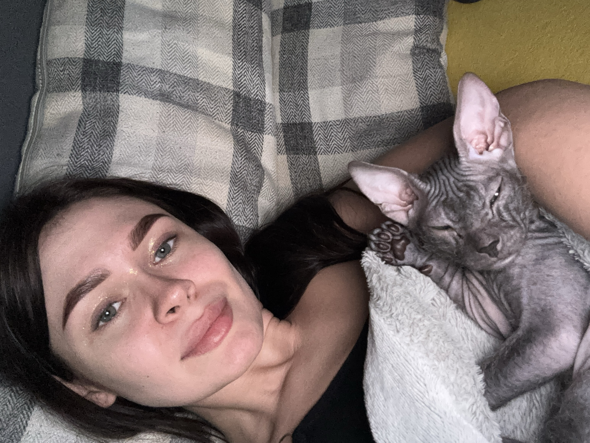 - "A woman with dark hair and sparkly makeup is lying on a plaid blanket next to a grey Sphynx cat" by FM-rdzlJ2, licensed under CC BY 4.0