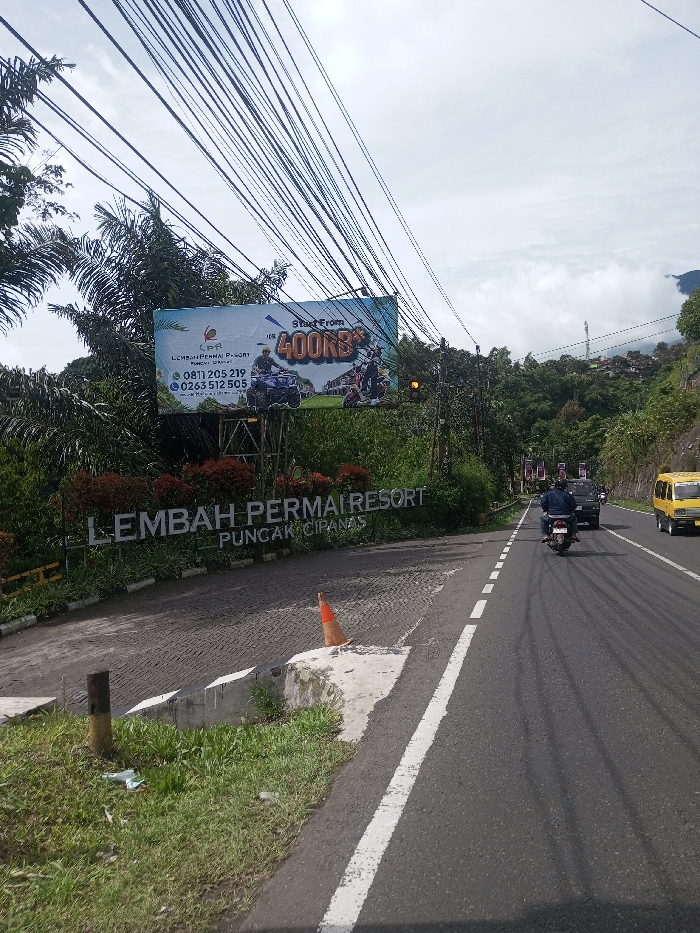 This image depicts a roadside scene on an overcast day, serving as an entrance to a resort. The location is identified by signage as "LEMBAH PERMAI RESORT PUNCAK CIPANAS." A large billboard above the entrance advertises "LEMBAH PERMAI RESORT" with text indicating "Start From 400RB*," showing images of ATV riders and resort buildings, along with contact numbers "0811 205 219" and "0263 512 505." The foreground features an asphalt road with a solid white line on its left edge, indicating a shoulder or lane boundary. A concrete barrier or curb separates the road from a grassy verge on the left, where a small orange traffic cone rests. Further left, a paved entrance road leads into the resort. Overhead, numerous electrical or utility lines traverse the sky diagonally from left to right. On the main road, a person wearing a dark jacket and helmet is riding a motorcycle away from the viewer. Behind the motorcycle, a dark-colored SUV is visible, and further down the road, a yellow van is parked or moving. The background reveals lush green trees and foliage, indicative of a hilly or mountainous terrain, with misty or cloudy conditions partially obscuring the distant hills. A tall, thin structure, possibly a communication tower, is visible on a distant ridge. The sky is largely overcast. The visible location, "Puncak Cipanas," contradicts the provided city of Sandamal Eliya, Sri Lanka, indicating the scene is in Puncak Cipanas, Indonesia.
