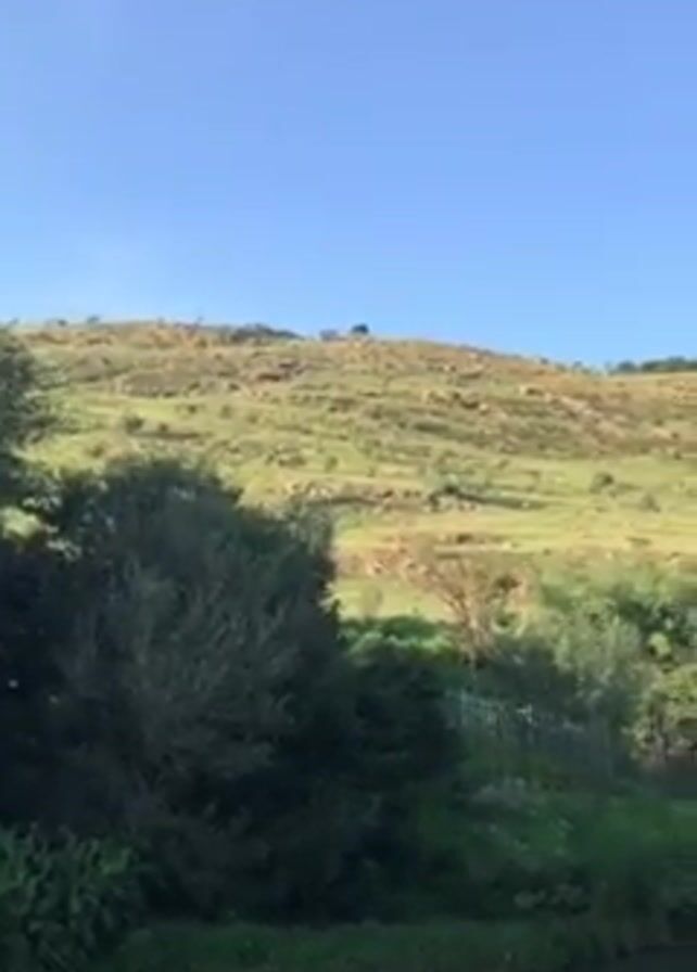 tranquil scene of a river flowing past a green, grassy hillside on a bright, sunny day with a clear blue sky. The hillside is sparsely dotted with trees and some rocky patches, and appears to be an upward slope. The river, which occupies the lower part of the frame, is surrounded by lush green vegetation. A few trees and shrubs line the riverbank. The camera slowly pans from left to right, revealing more of the river and the verdant landscape.