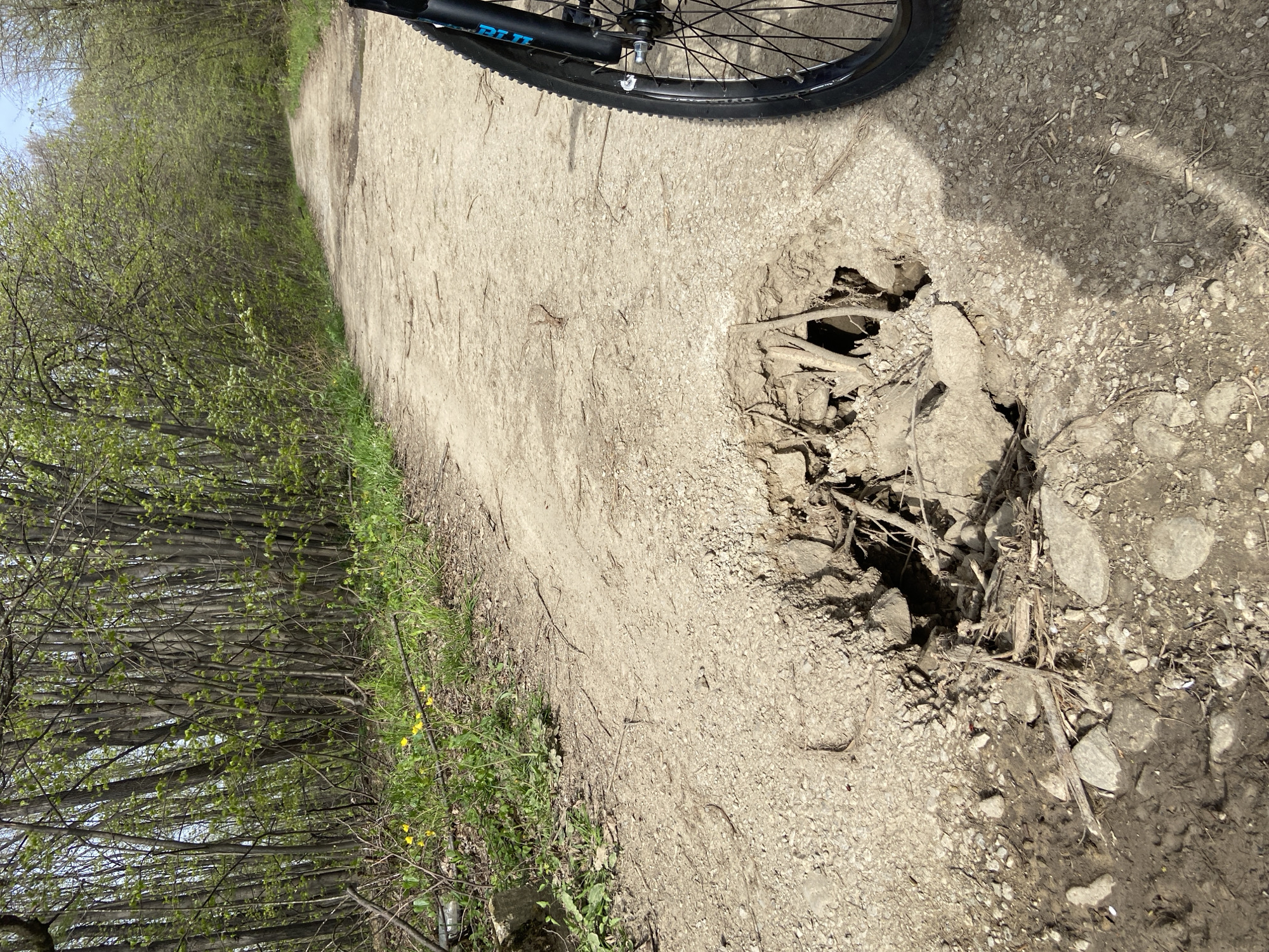 dirt road in Pchelishte, Bulgaria, with a bicycle wheel visible in the upper right corner. The road has a large hole, approximately 30 cm in diameter, filled with tree roots and some rocks. Vegetation, including trees and some yellow flowers, lines the left side of the road. The scene suggests a trail or path in a natural area.