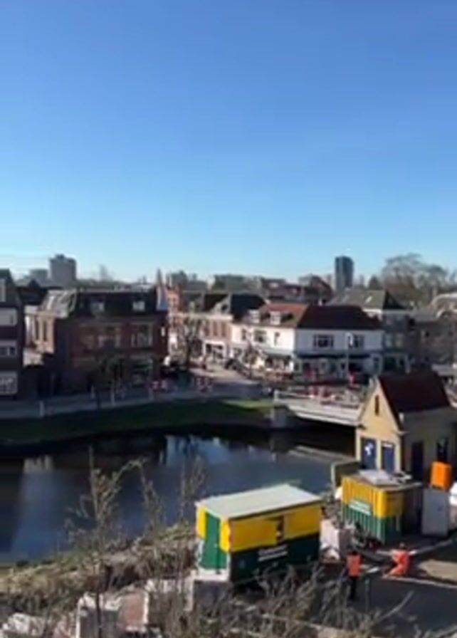 view of a waterway or canal running through a town or city. The camera slowly pans from right to left, capturing the scene. In the foreground, there is construction work underway on a paved area. There are construction materials, containers, and a small building. Workers in orange vests can be seen near the containers. Beyond this construction zone, the canal reflects the buildings and sky above. On the opposite side of the canal are buildings with varied architectural styles, mostly multi-story structures with a mix of residential and commercial uses. Trees line the waterway, their branches bare, suggesting it might be late fall or winter. A few cars and a white van can be seen parked along the street. In the background, more buildings and city infrastructure are visible under a bright, clear sky. The overall scene conveys a sense of urban life alongside a calm waterway, with the ongoing construction adding a dynamic element to the view.