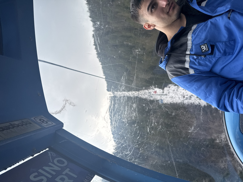 The image depicts the interior of a blue gondola lift cabin, positioned on a mountainside in Bansko, Bulgaria. A young male individual is visible in the lower right portion of the frame, partially cropped. He has short dark hair and is wearing a blue, black, and grey winter jacket with a "W Wenaues" logo on the left chest, over a dark underlayer. He is looking towards the camera with a slight smile. The gondola's panoramic window, heavily scratched and showing ice or water streaks, dominates the center and left of the image. Through this window, a steep, snow-covered slope is visible, extending into the distance where other gondola cabins (one red, one blue) are present along a prominent suspension cable. Dense evergreen forest covers the adjacent mountainous terrain. A blue sign with partial white text "CASINO RESORT" is visible on the upper left interior frame of the gondola. The sky outside is overcast and light grey. The scene indicates travel within a ski resort environment.